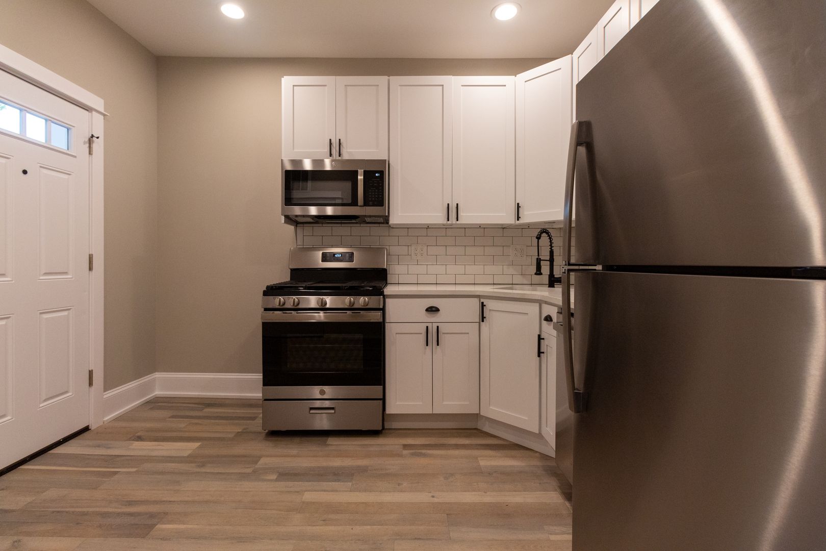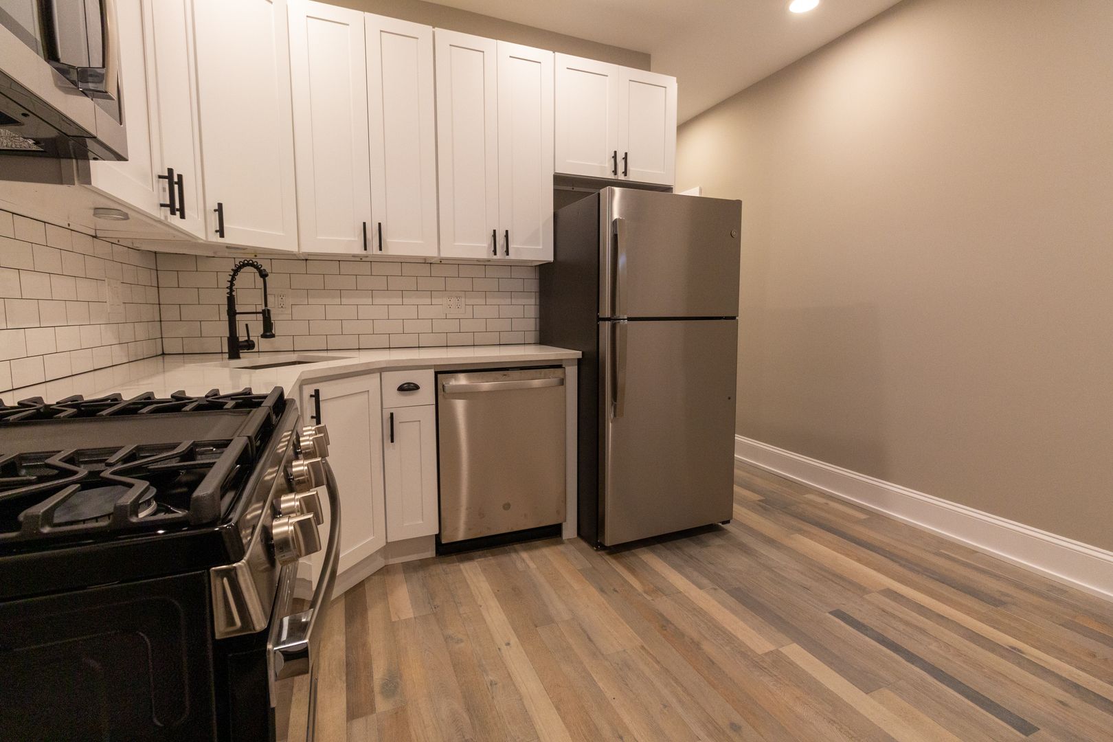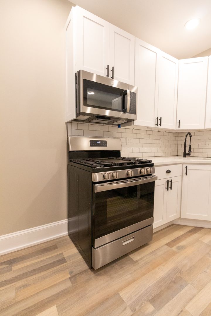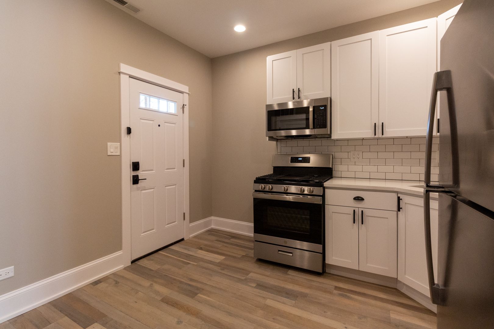 Fresh, neutral paint, engineered hardwood flooring, and recessed lighting throughout. The kitchen features stainless steel appliances including dishwasher, microwave, oven/range, and refrigerator. It is beautifully adorned with white quartz countertops, 42-inch white shaker wall cabinets, and ceramic white subway tile backsplash. Kitchen also has a garbage disposal and an icemaker. Living room and all bedrooms are cable ready. Luxury bathrooms with beautiful ceramic white subway wall tiles and matte porcelain floor tiles. In-unit washer and dryer. Central heat and air conditioning. Front door intercom system. Keyless entry.