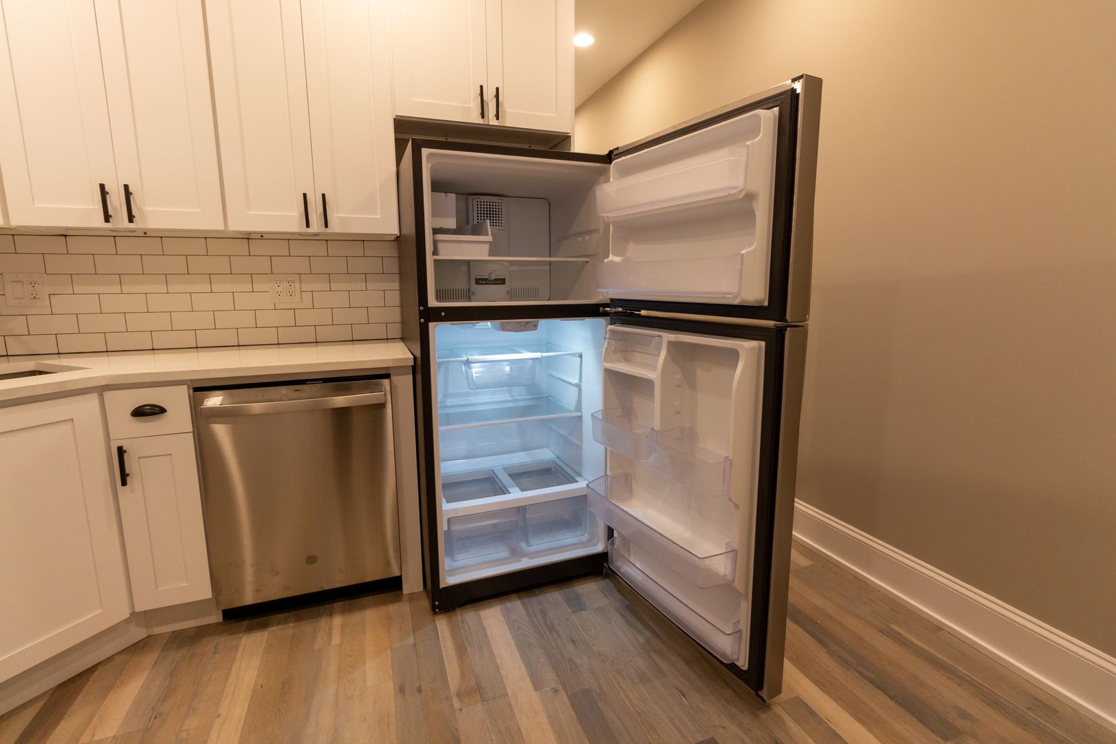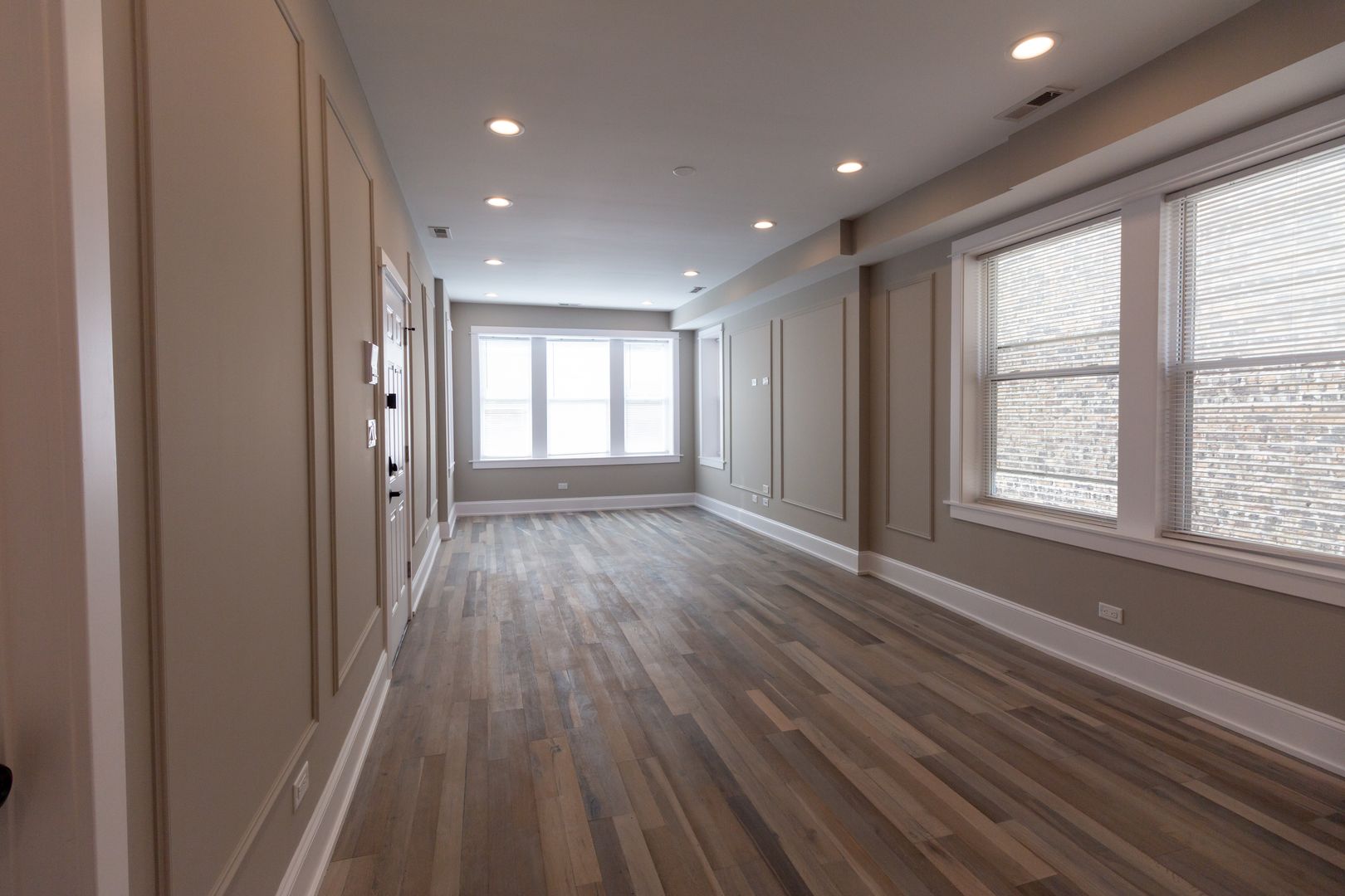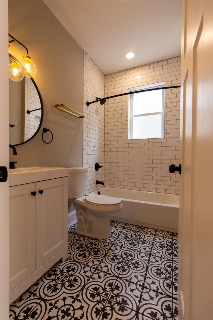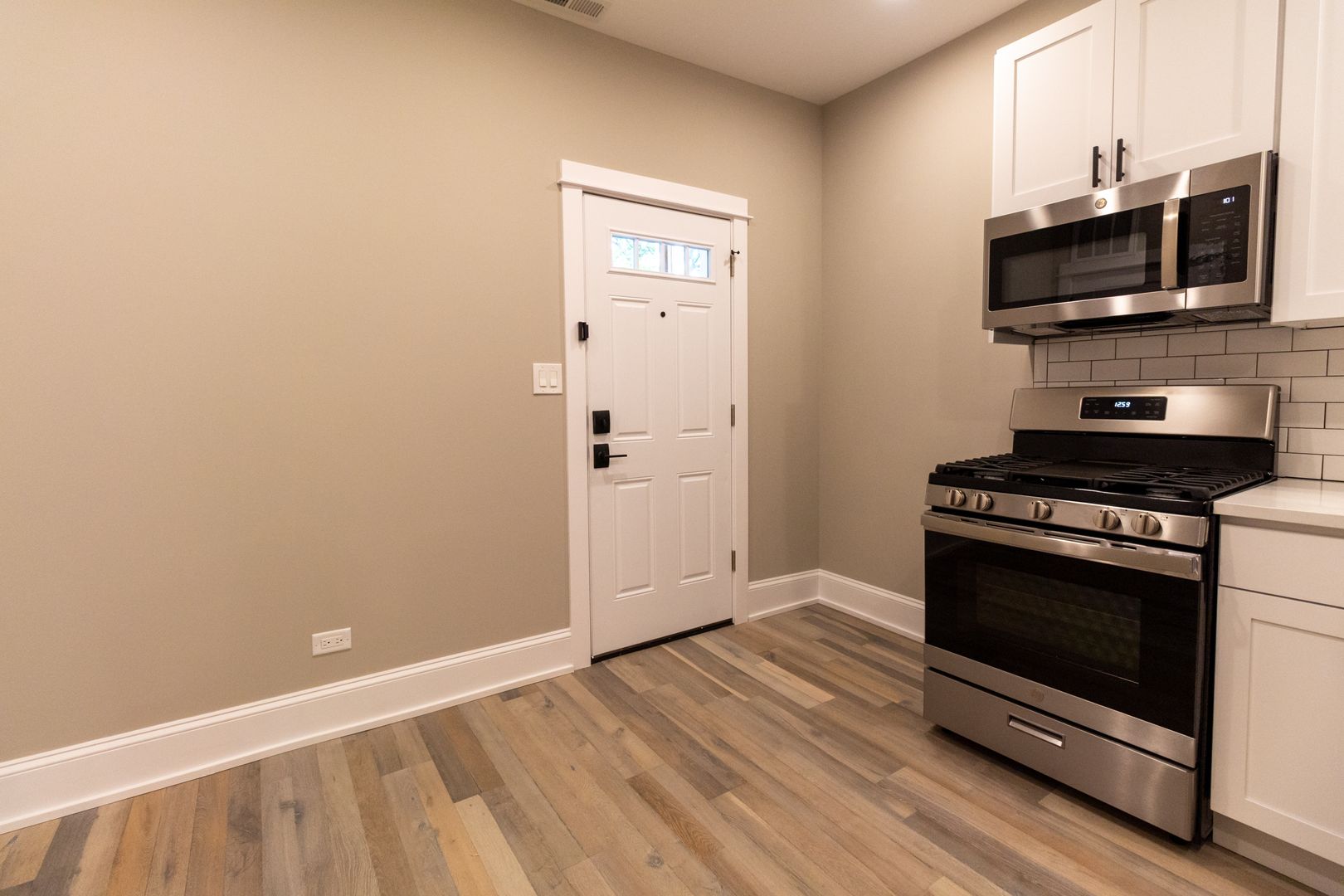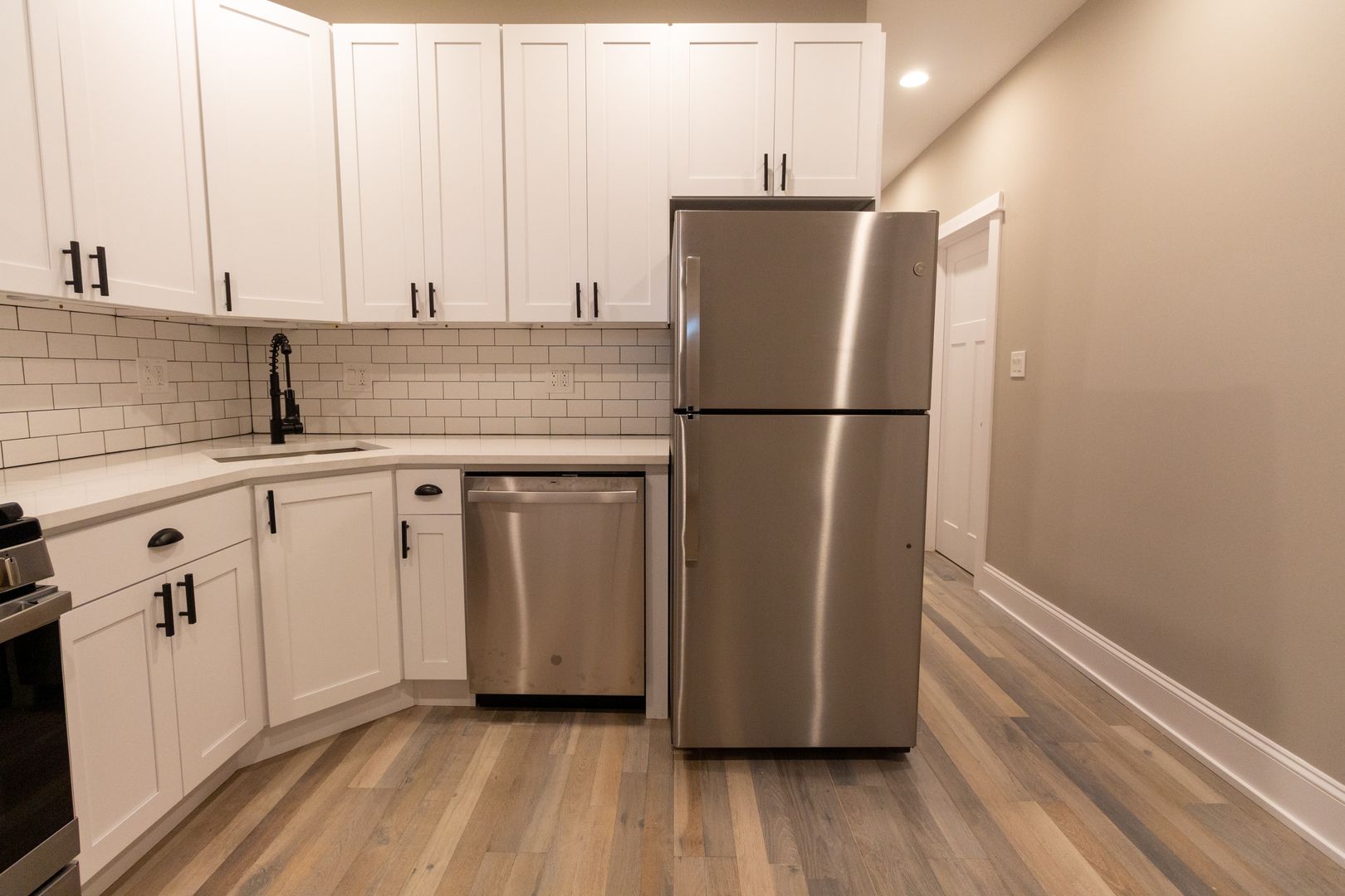 Fresh, neutral paint, engineered hardwood flooring, and recessed lighting throughout. The kitchen features stainless steel appliances including dishwasher, microwave, oven/range, and refrigerator. It is beautifully adorned with white quartz countertops, 42-inch white shaker wall cabinets, and ceramic white subway tile backsplash. Kitchen also has a garbage disposal and an icemaker. Living room and all bedrooms are cable ready. Luxury bathrooms with beautiful ceramic white subway wall tiles and matte porcelain floor tiles. In-unit washer and dryer. Central heat and air conditioning. Front door intercom system. Keyless entry.