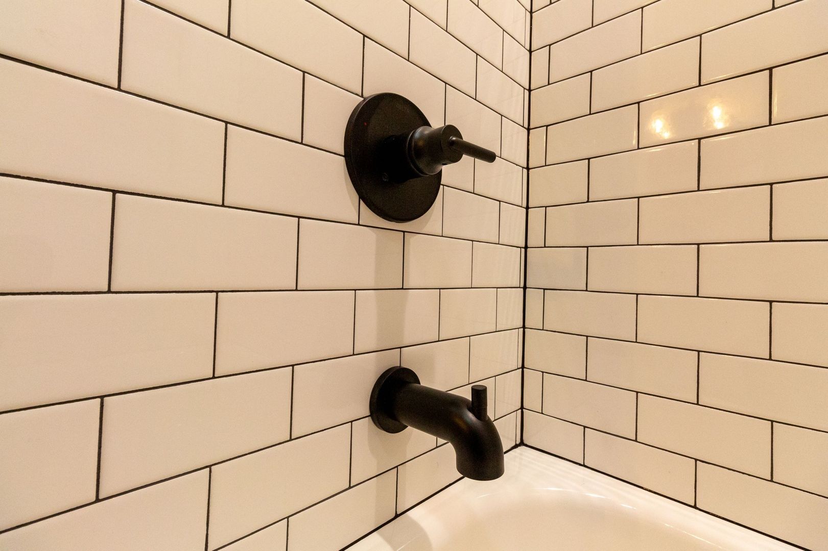 The luxurious bathroom is outfitted with contemporary ceramic subway tiles and matte porcelain floor tiles, providing a clean, fresh look.