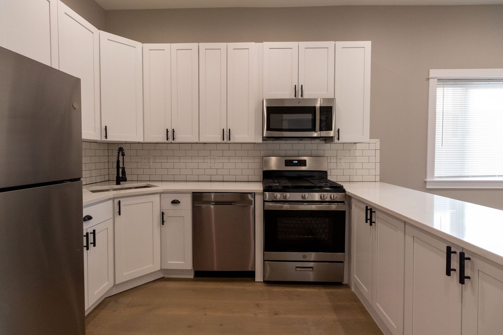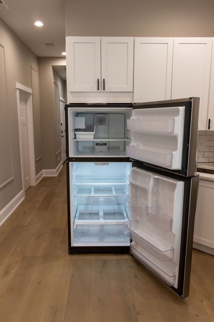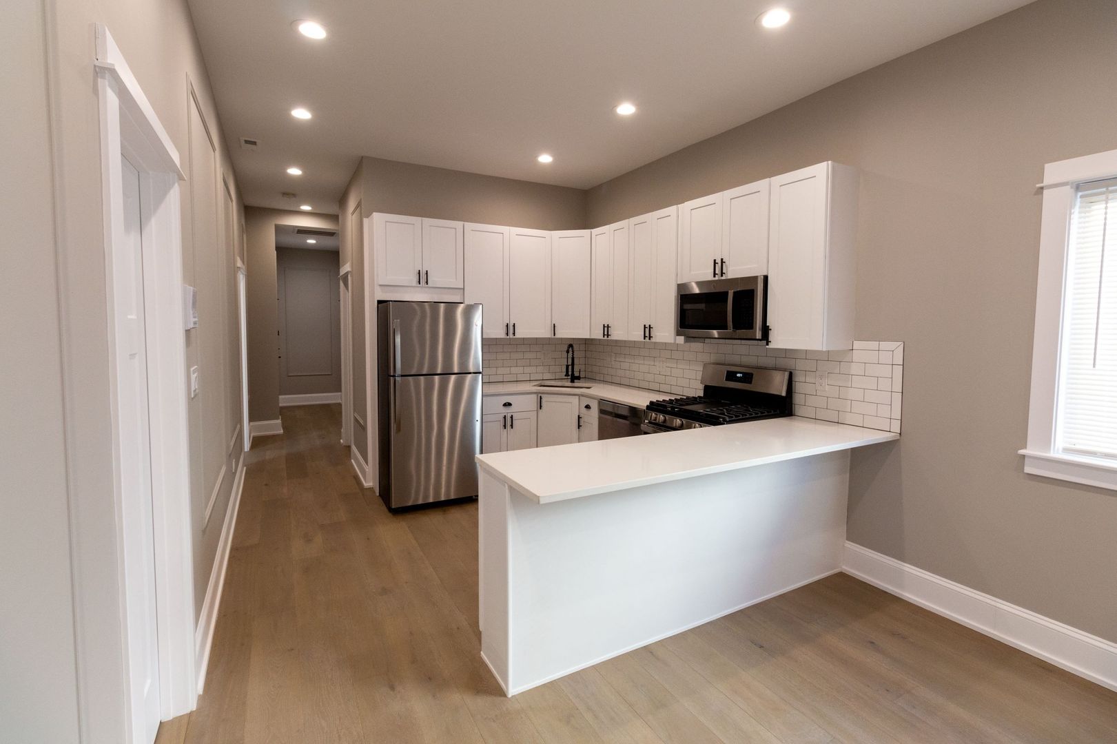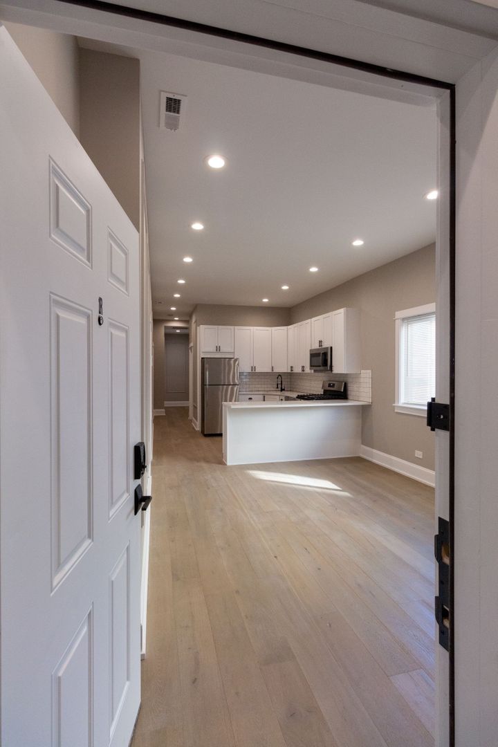 Enjoy neutral tones, engineered hardwood floors, and recessed lighting throughout. The open-concept kitchen is a highlight, boasting brand-new stainless steel appliances (dishwasher, microwave, oven/range, and refrigerator), complemented by white quartz countertops, 42-inch white shaker cabinetry, and a stylish ceramic subway tile backsplash. Additional touches include a garbage disposal and icemaker for extra convenience.