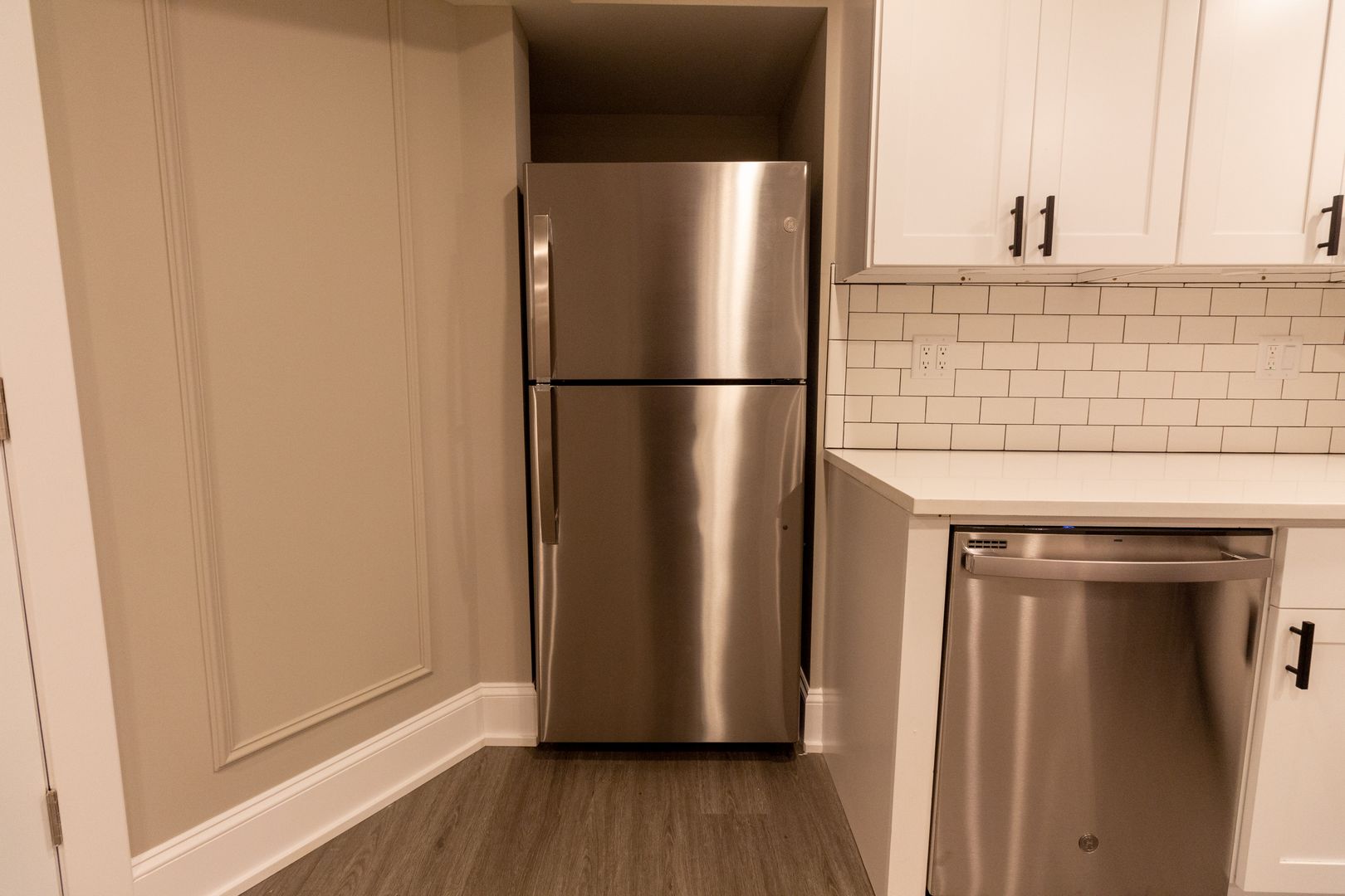 Everything in the unit has been newly renovated. Fresh, neutral paint, engineered hardwood flooring, and recessed lighting throughout. The kitchen features new stainless steel appliances including dishwasher, microwave, oven/range, and refrigerator. It is beautifully adorned with white quartz countertops, 42-inch white shaker wall cabinets, and ceramic white subway tile backsplash. Kitchen also has a garbage disposal and an icemaker. Living room and all bedrooms are cable ready. New luxury bathrooms with beautiful ceramic white subway wall tiles and matte porcelain floor tiles. In-unit washer and dryer. Central heat and air conditioning. Front door intercom system. Keyless entry.