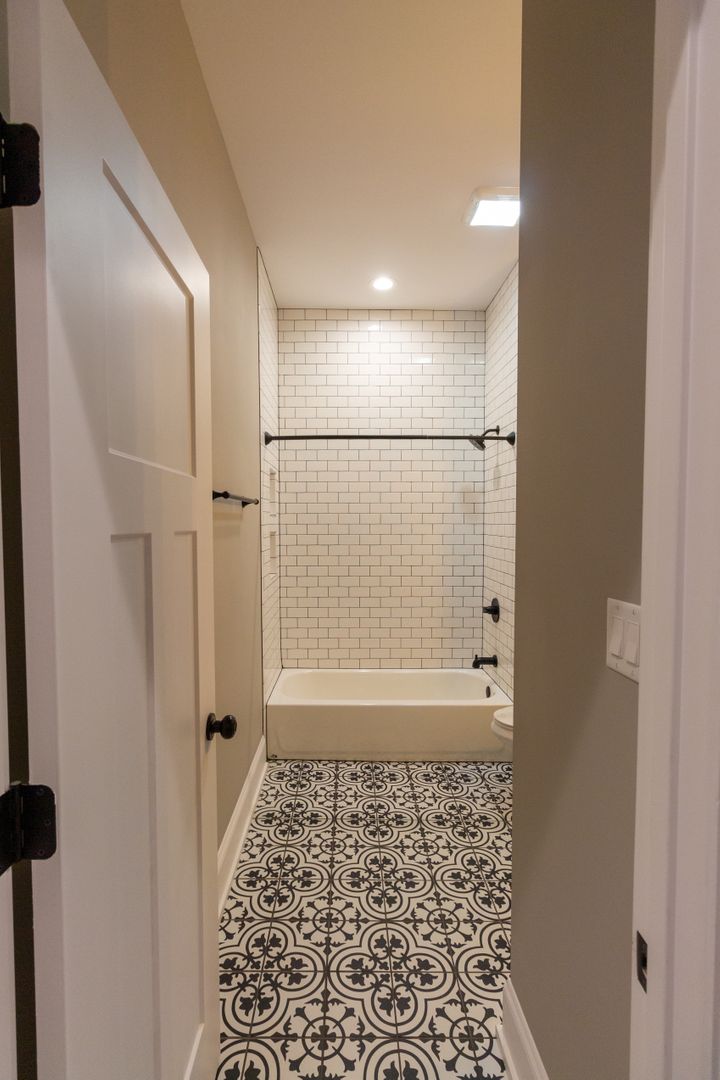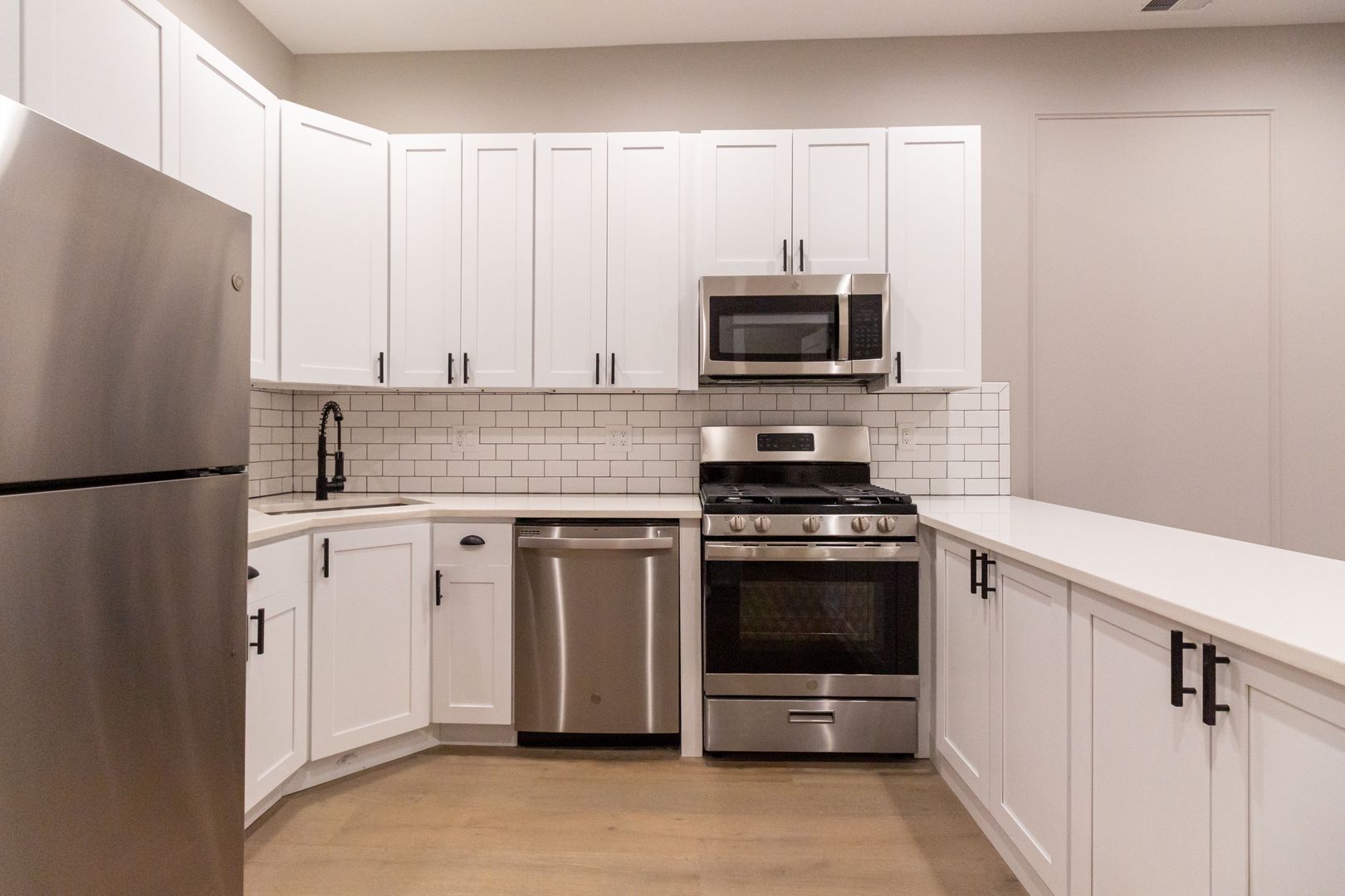 The kitchen is a chef’s dream, showcasing high-end white quartz countertops, sleek stainless steel appliances, white shaker cabinets, and a stylish subway tile backsplash. This space is perfect for cooking and dining, making every meal a pleasure.