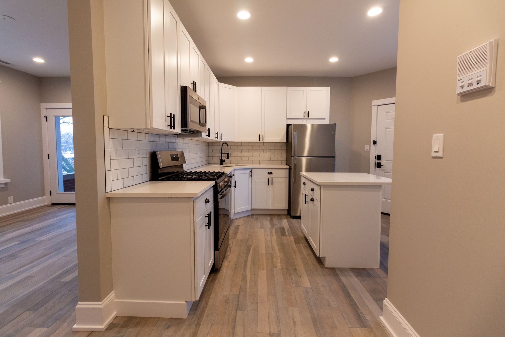 Everything in the unit has been newly renovated. Fresh, neutral paint, engineered hardwood flooring, and recessed lighting throughout. The kitchen features new stainless steel appliances including a dishwasher, microwave, oven/range, and refrigerator. It is beautifully adorned with white quartz countertops, 42-inch white shaker wall cabinets, and ceramic white subway tile backsplash. Kitchen also has an island perfect for entertaining and meal prepping. Garbage disposal and an ice maker installed. Living room and all bedrooms are cable ready. New luxury bathrooms with beautiful ceramic white subway wall tiles and matte porcelain floor tiles. In-unit washer and dryer. Central heat and air conditioning. Front door intercom system. Keyless entry. Private balcony right off of the living room.