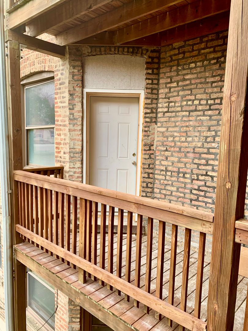 Private, covered outdoor balcony, large kitchen with island, new stainless steel appliances, hardwood floors, and just a block and a half away from the Blue Line train.